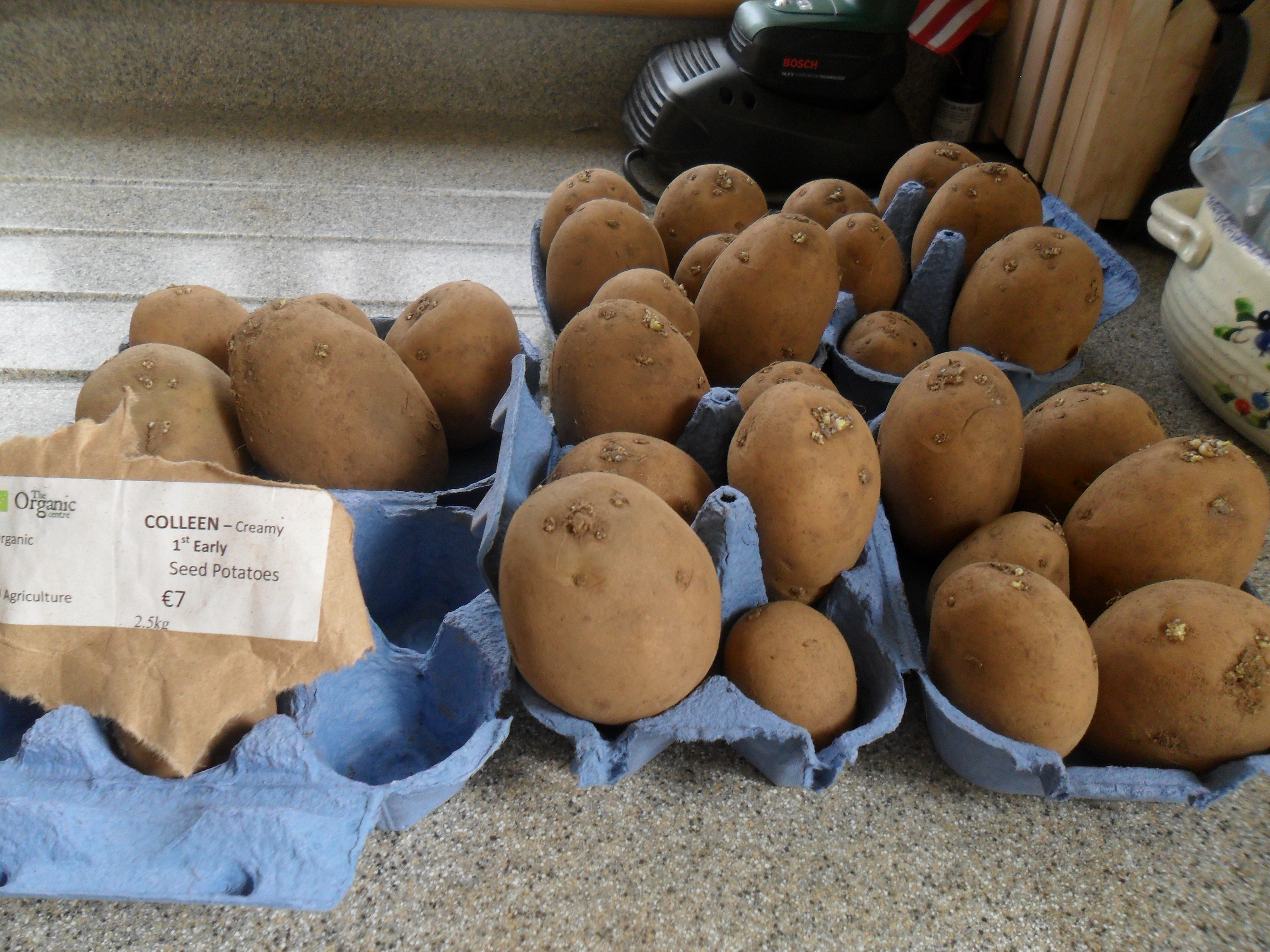 I am very excited to try planting potatoes this year! Last week I ordered my organic “Colleen” early seed potatoes, and some “Sarpo Mira” main crop seed potatoes from The Organic Center in County Leitrim. They arrived in no time, and I now have the early spuds sitting in egg cartons for about two weeks while they sprout. In the meantime, I’ve prepped two areas for potatoes. The first area I started about two months ago, by laying down newspapers and cardboard. Just recently, I added compost on top. (O.K., the “I” here is actually my husband!) The next step is to throw some topsoil on. I’m planning that will happen in the next two weeks when the early potatoes will be ready to be planted.