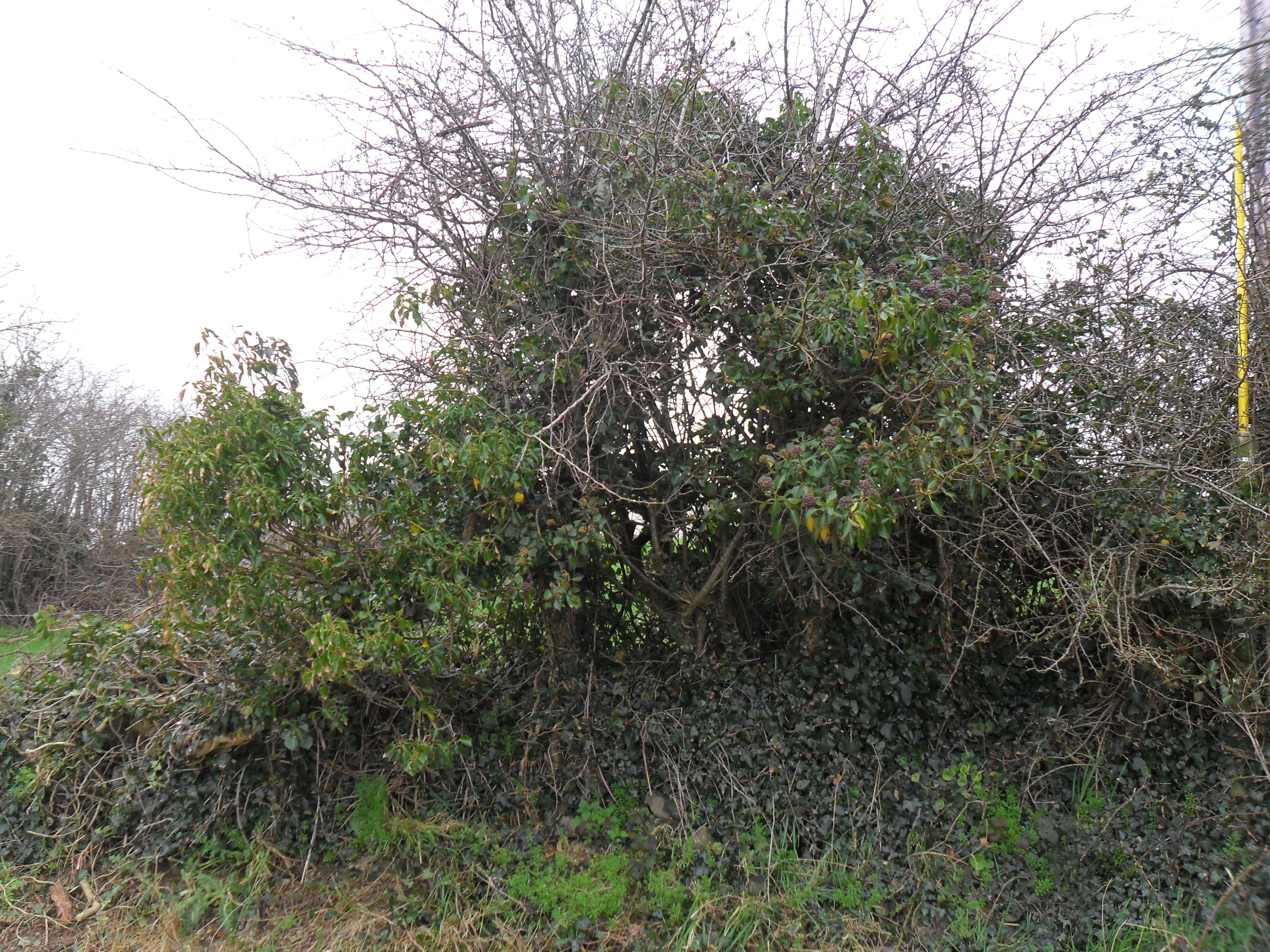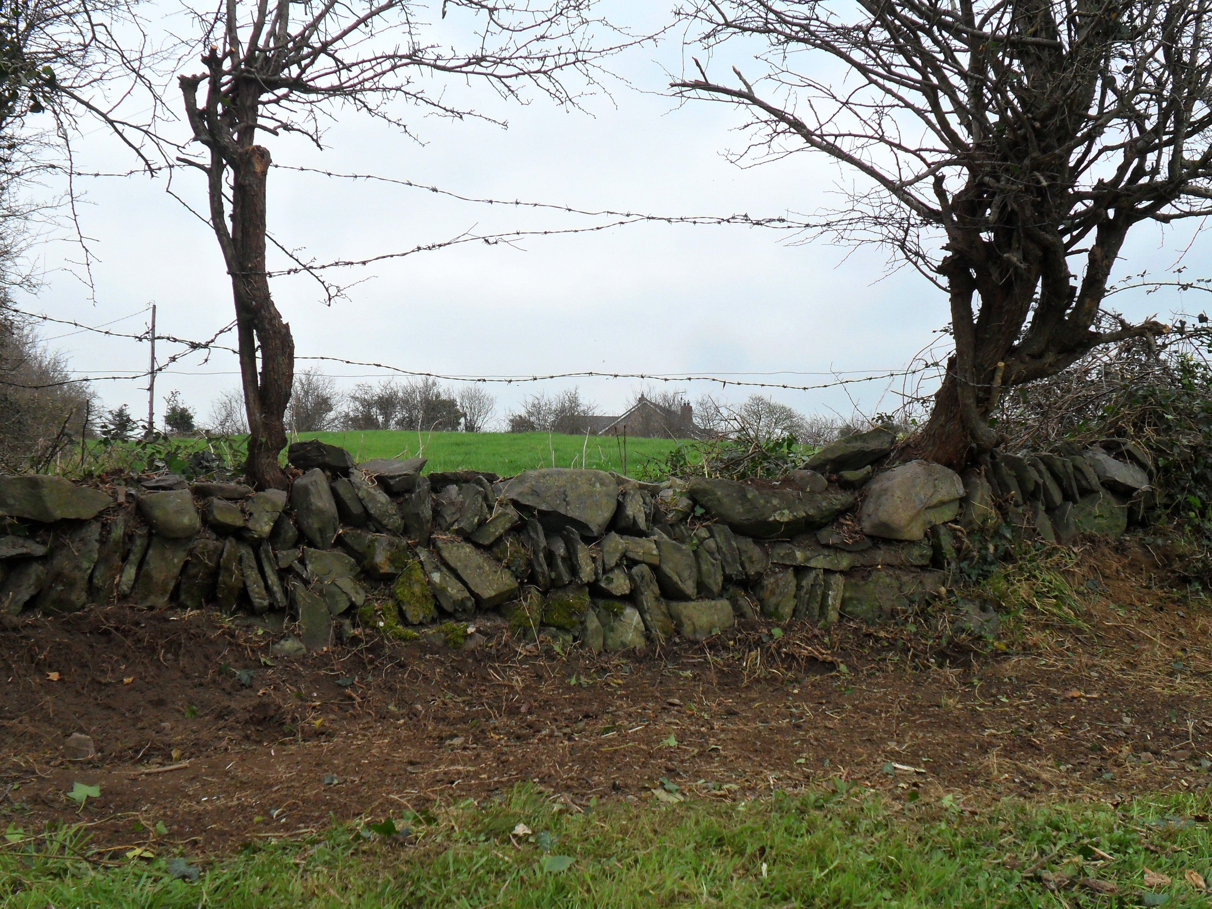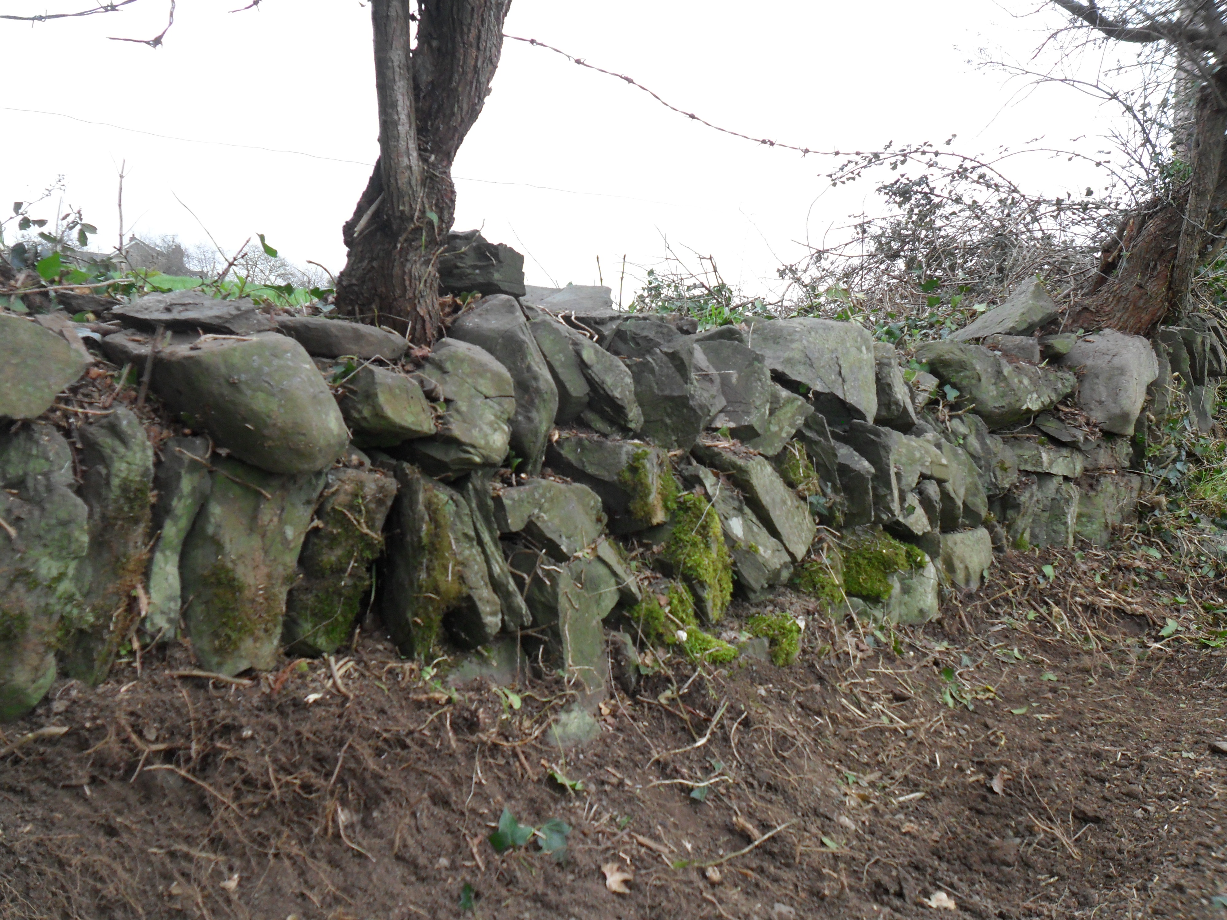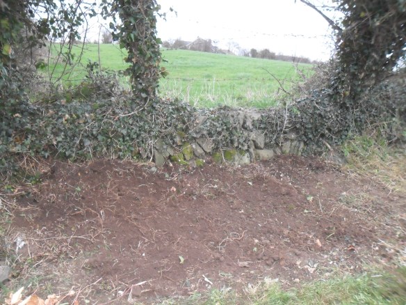 The first year here, I spent a lot of time cutting away brambles. Piles and piles of brambles. We could, sort of, make out the wall after I cleared the brambles. Our row of Hawthorns, and the ditch wall, are completely covered in ivy and whatever brambles that weren’t cut down last year. This year, I’ve taken on the challenge of attacking the ivy. This is quite an undertaking! Ivy can take on a life of it’s own and completely attack trees and the surrounding area. I’m taking it one step at a time. I have the eye on the prize: I want to grow wild flowers along the stone wall; the small, stone, ditch wall, that I think is just beautiful!