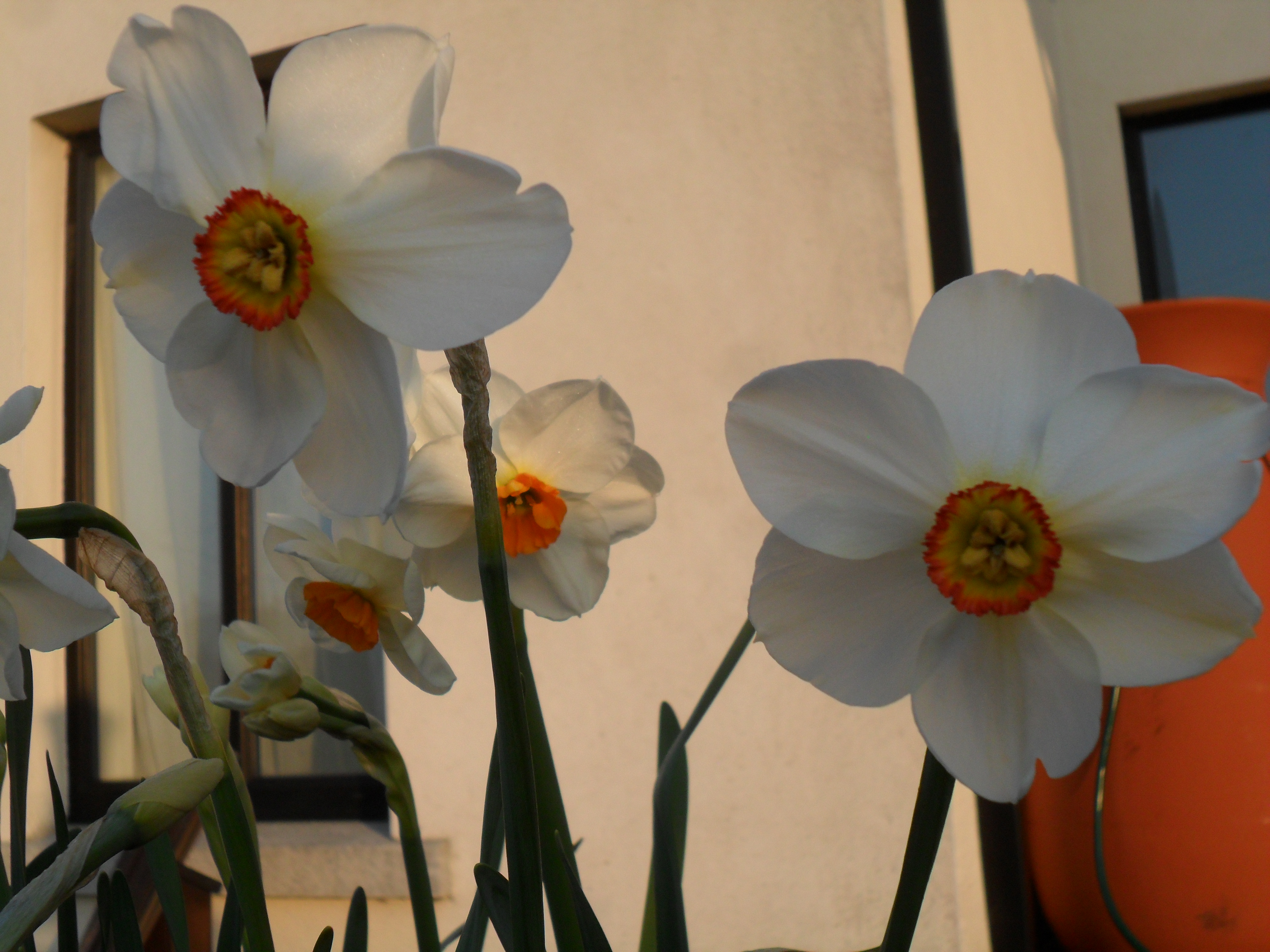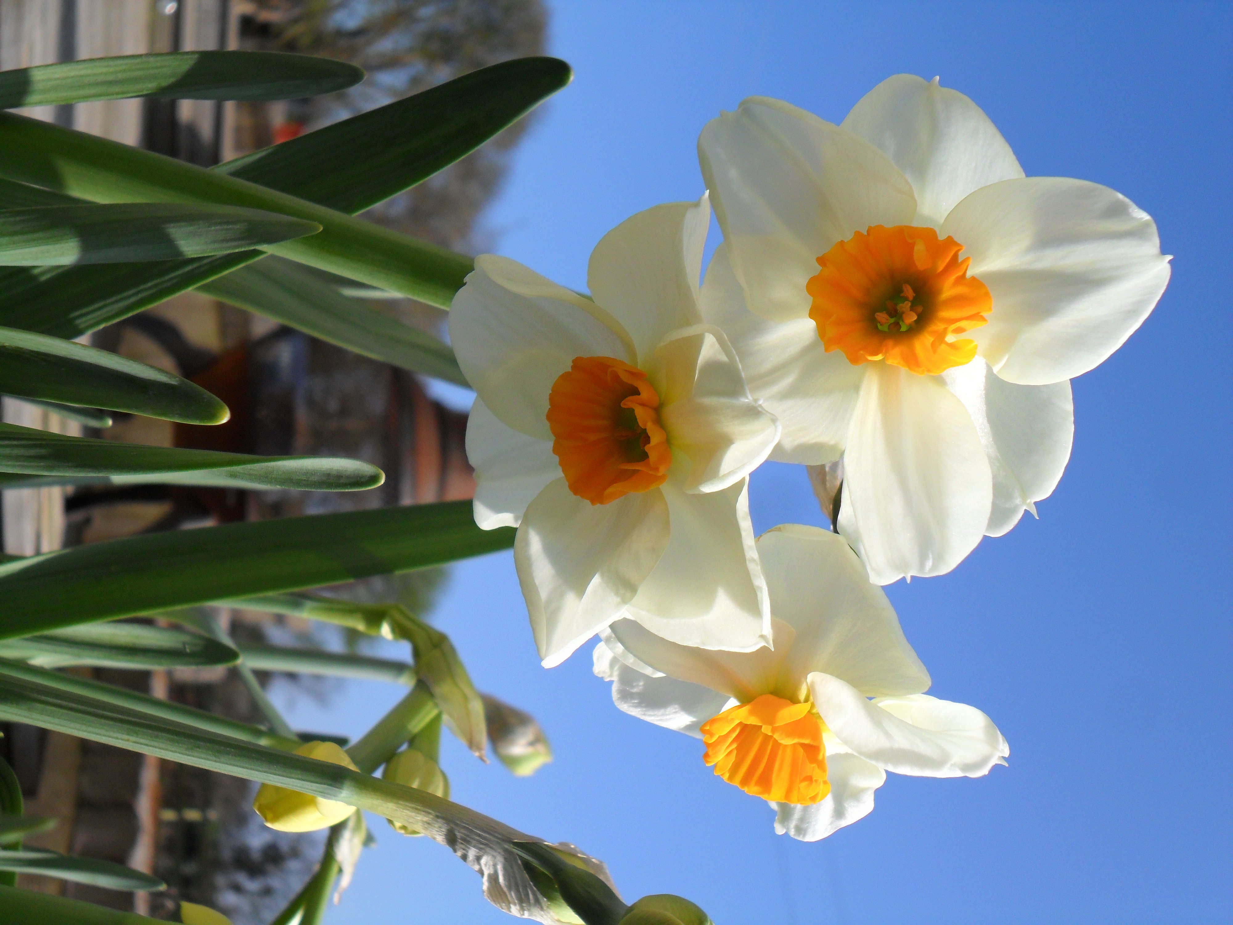 Busy. Boy do I feel busy. There’s kids’ activities, shopping, cleaning, more kids’ activities, gardening (if I’m lucky), oh and the swim coaching course I’m taking (must finish up my homework before class this weekend!). This week seems a bit more full than usual. Deep breath in, hold, and exhale. I’ll just have to take it one day at a time. The weather has been so glorious this past week. That’s part of the problem, actually. With such good weather I want to spend every minute outside in the garden. But my schedule has other plans for me right now. So I take what gardening time I can get. Today I managed to cover my second plot for potatoes with soil. I was very happy to be able to cross that off of my list! Do you remember the containers outside of my kitchen window? The daffodils are finally blooming and they are so pretty! They are a little unusual and fragrant, too. Little rays of sunshine to compliment the wonderful weather we’ve been having! I was glad to stop and smell the “roses”, and photograph them too, of course!