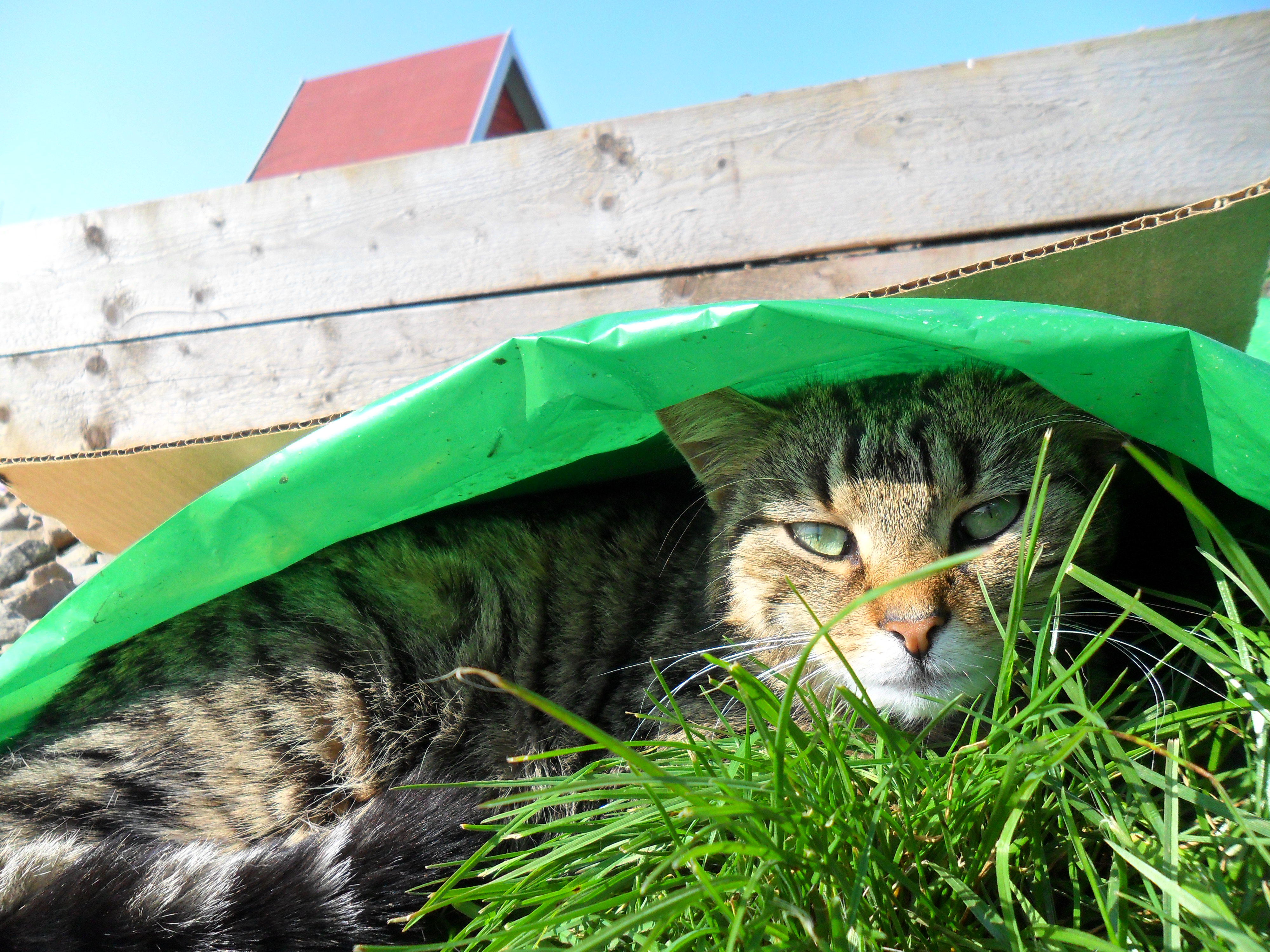 Lucy relaxing under the plastic from stone pathway between the raised beds.