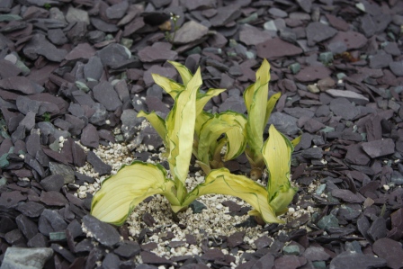 A couple different varieties of hosta.  Slugs love hosta, so I put some organic slug pellets around them (works ok, but daily checking is only sure way to keep slugs from devouring the plants).
