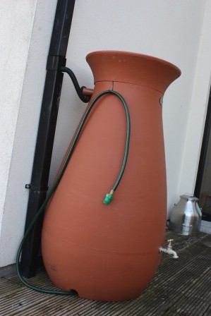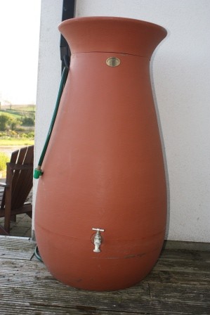 Well, I think it’s pretty!  This is our new “Terracotta Look Water Butt” (rain trap system).  It’ll hold 245 liters of water.  It’s hooked up to our drain pipe.  We saw this when we were at the Dublin “Bloom” festival last year.  http://bloominthepark.com/   I like the idea of using rain water in the garden, and I think it looks nice too!  We aren’t currently charged for water use in Ireland, but they are planning on introducing charges in the near future.  Either way, I like the idea of “catching” rain water and using it.   Funny thing is, the price of the rain catcher has taken a big jump up this year. I’m guessing it’s because of the impending water charges.  That’s too bad.  We thought it was a reasonable price that we paid (160 euro).  It’s now 245 euro.  http://www.rainbarrels.ie/cascata-authenthic-terracotta-look-water-butt-p-843.html?osCsid=lbu9dkp336urikn9g3o1cq9sj7