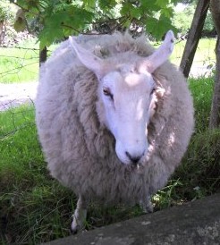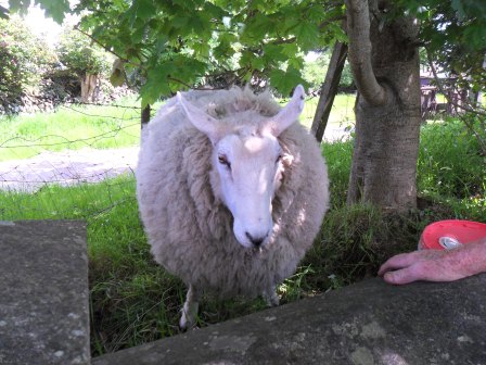 We live a mile from the village where my daughter goes to school.  Our youngest is our last one at the primary school, as her brother and sister have now moved on to secondary schools outside of the village.  This is the final week before summer holidays.  The weather was so nice yesterday that we decided to walk to school.  What a treat!  On our way home, we met up with our neighbor.  He is such a gentleman.  He also happens to have 3 sheep in his front yard.   I joke that they are the token sheep, since the area we live in is called “Sheepwalk”.   Tootsie Wootsie (what a great name for a sheep!) happened to be near the gate while we were chatting, so she came over to say hello.  She is huge and very friendly!
