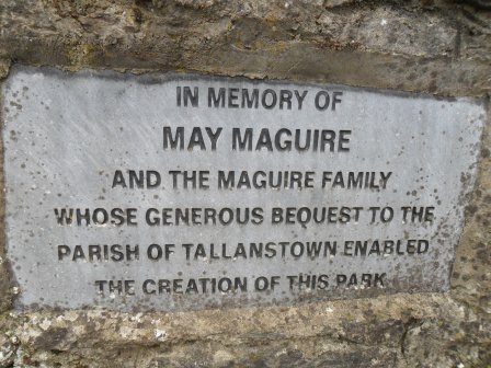 Plaque at the entrance to park in Tallanstown. Published July 2, 2012 at 448 × 336 in A visit to Tallanstown, Co. Louth, Ireland. The Maguire family’s donation helped fund the park.