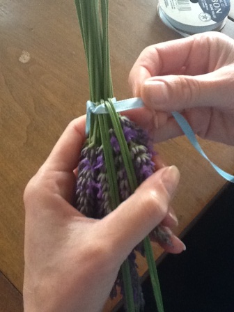 It’s July and my lavender is in full bloom.  Just brushing past it gives off a wonderful scent. This usually happens in the evening as I’m pulling off slugs from the neighboring hosta and lilies, so it’s a welcome reprieve from such yucky work!  I came across lavender wands a couple of years ago, and have decided I really like making them.  It’s fun to work with my hands, and it smells so lovely during the weaving process.  It’s not difficult to do, either.    I gather a handful of stems, tie them together, fold the stems over the blooms, weave the ribbon, and finish with a little bow!  🙂  Here are a couple of pictures of the process: