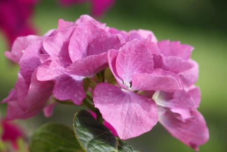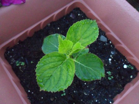 Having friends who like to share their flowers is such a great thing.   A lot of my garden (flowers and fruits) are from friends and family.  My friend Susan has such a beautiful and well loved garden.  After one visit to her last year, I left  with a gorgeous bouquet of blue hydrangea.  I had the arrangement up high in my kitchen, and well,  just left it there.  Some of the blooms actually dried,  which I think is also very pretty.  One bloom had just enough water to grow roots.   Roots!  O.K., for those with Green Thumbs this would be no big deal, but for me it was huge!  I put the cutting in a small pot, out of the sun, in our laundry room.  I watched it die down, and then miraculously start to grow again.  I waited until I had transplanted it into a bigger pot before even telling Susan. I didn’t want to take any chances that it might not make it!  Now it is in a bigger pot, with a big flower and seeming to be very happy.  The color has changed; it’s now pink.  I only have it in a peat/compost mixture though.  I’ll have to wait until I plant it in the soil to see what color it will be in my garden.