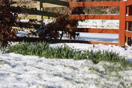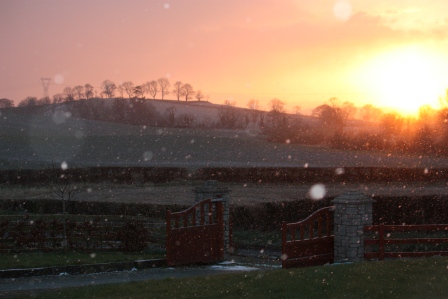 Snow and freezing temperatures?  In March?  In Ireland? Well, it isn’t what I would expect from a generally mild climate, but there you have it.  I have to say that the cold weather has allowed me to organize some of the inside of my house without feeling the pull of the garden!  I guess I needed that excuse to get my work done. Yesterday we had snow, sun, more snow, and more sun.  I took a bunch of photos throughout the day and this morning, all from the same spot.  That would be called distraction from housework. 🙂