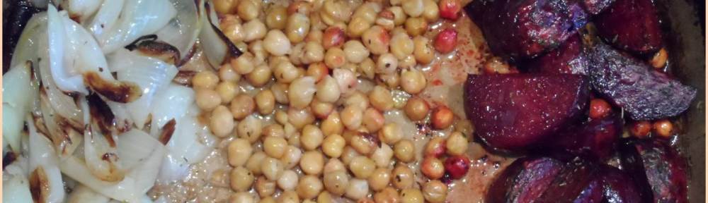 I used a high heat: 450 degrees Fahrenheit/ 230 degrees Celsius. The beets and onions I peeled, cut, and covered in olive oil and Herbes de Provence spices. The chickpeas were covered in olive oil and a bit of Cajun spice mix. They were cooked in about 30 minutes, after turning them half-way through. SO EASY. and delicious.