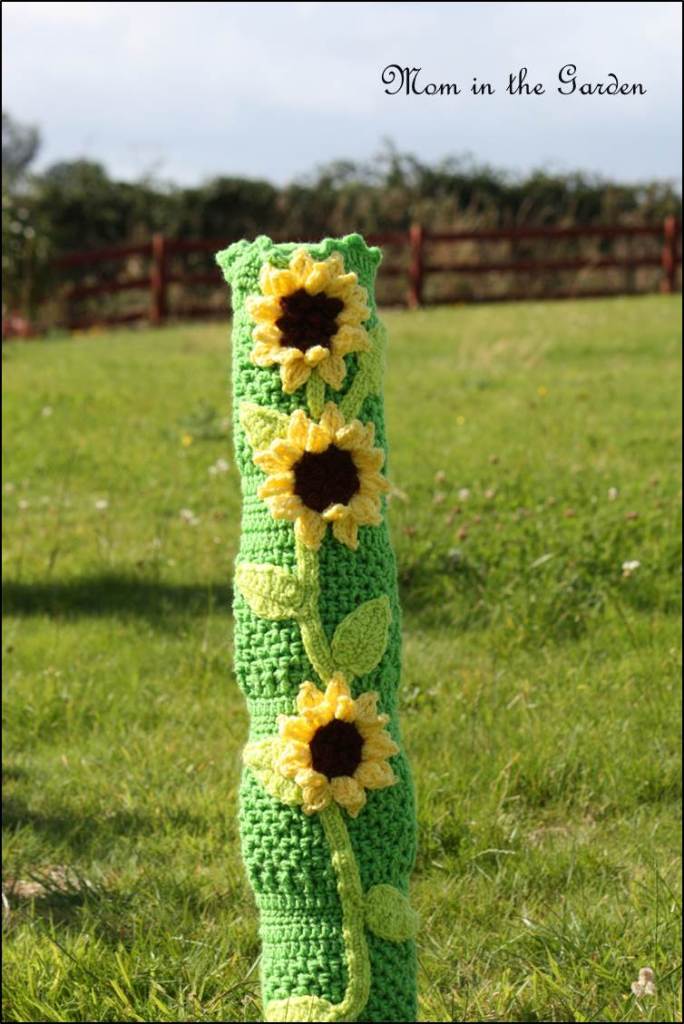 Sewer pipe yarn bomb 2 Published August 17, 2014 at 754 × 1129 in Yarn bombing in the back yard (goodbye to sewer pipe ugliness!) Yarn bombing the sewer pipe with sun flowers