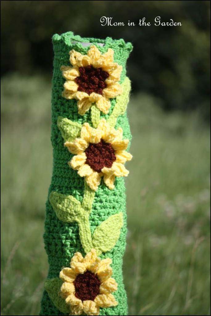 Sewer pipe yarn bomb Published August 17, 2014 at 754 × 1129 in Yarn bombing in the back yard (goodbye to sewer pipe ugliness!) Sewer pipe yarn bomb of crocheted sun flowers