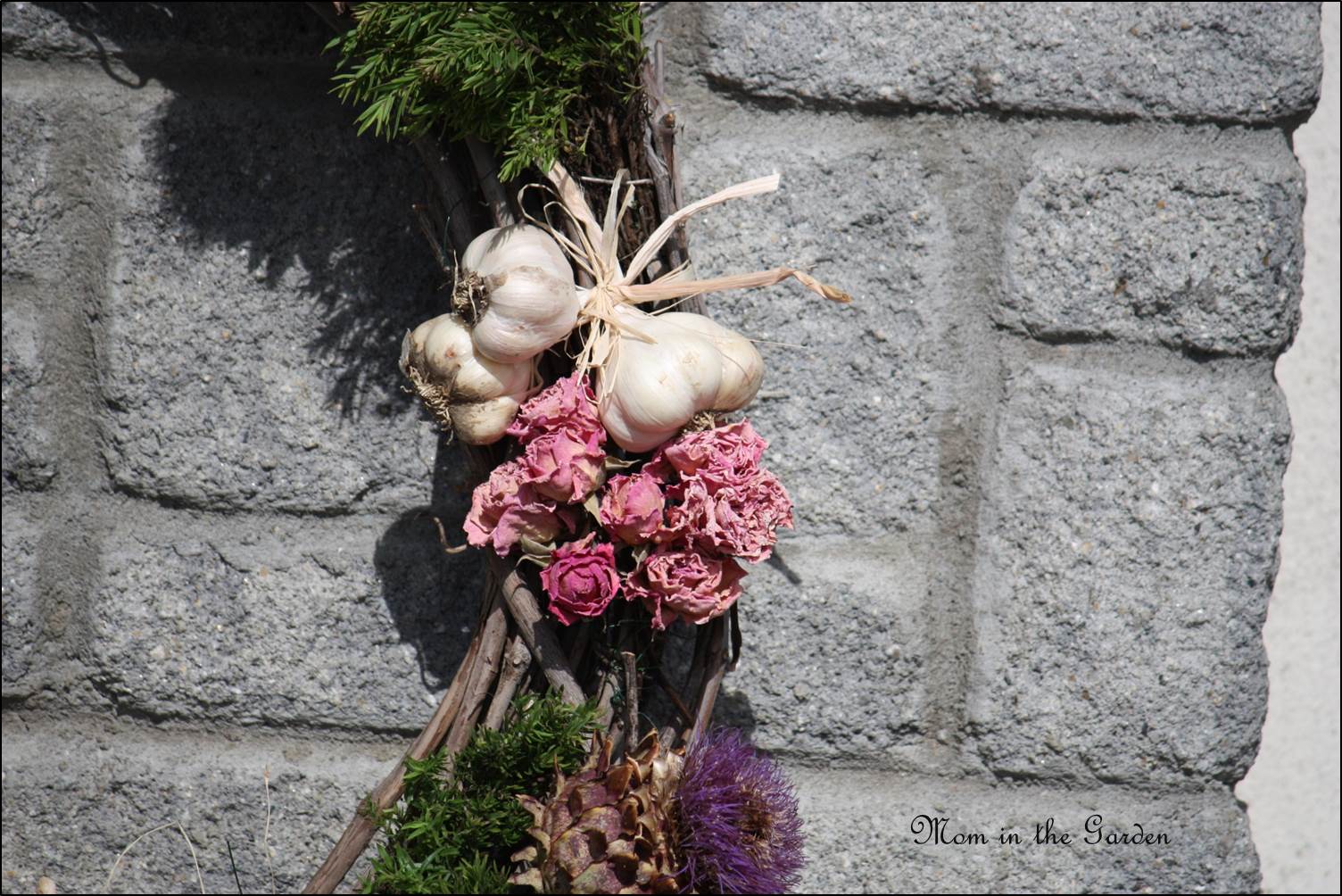 Garlic Wreath roses and garlic Published August 28, 2014 at 1504 × 1004 in Grow your own/Make your own: A Garlic Wreath with panache! Garlic with dried roses and artichokes from the garden