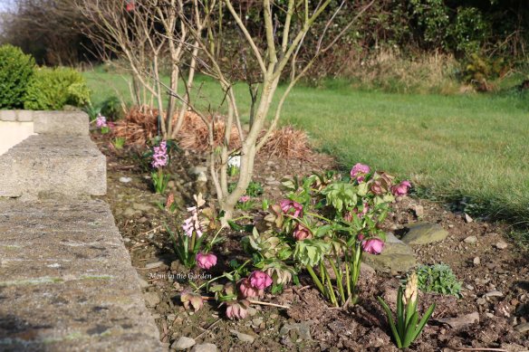 This very odd shaped bed is my favorite at the moment. The odd shape is due to the location – it is right in front of our shed. The choice is to either have the odd shape or have a straight line and anything that I plant in that space will be run over by the mower when it is put in/out of the shed. I’ve opted for the odd shape! There is a hellebore plant (frilly Isabelle) in this bed that has just been beautiful all winter. The hyacinth are just popping up now. The lilac shrubs are full of little buds, as is the hydrangea plant. The iris and hosta are still sleeping, but they have plenty of time yet. And last to bloom, at the end of summer, will be the asters. It is still a work in progress, but I love this strip of garden!