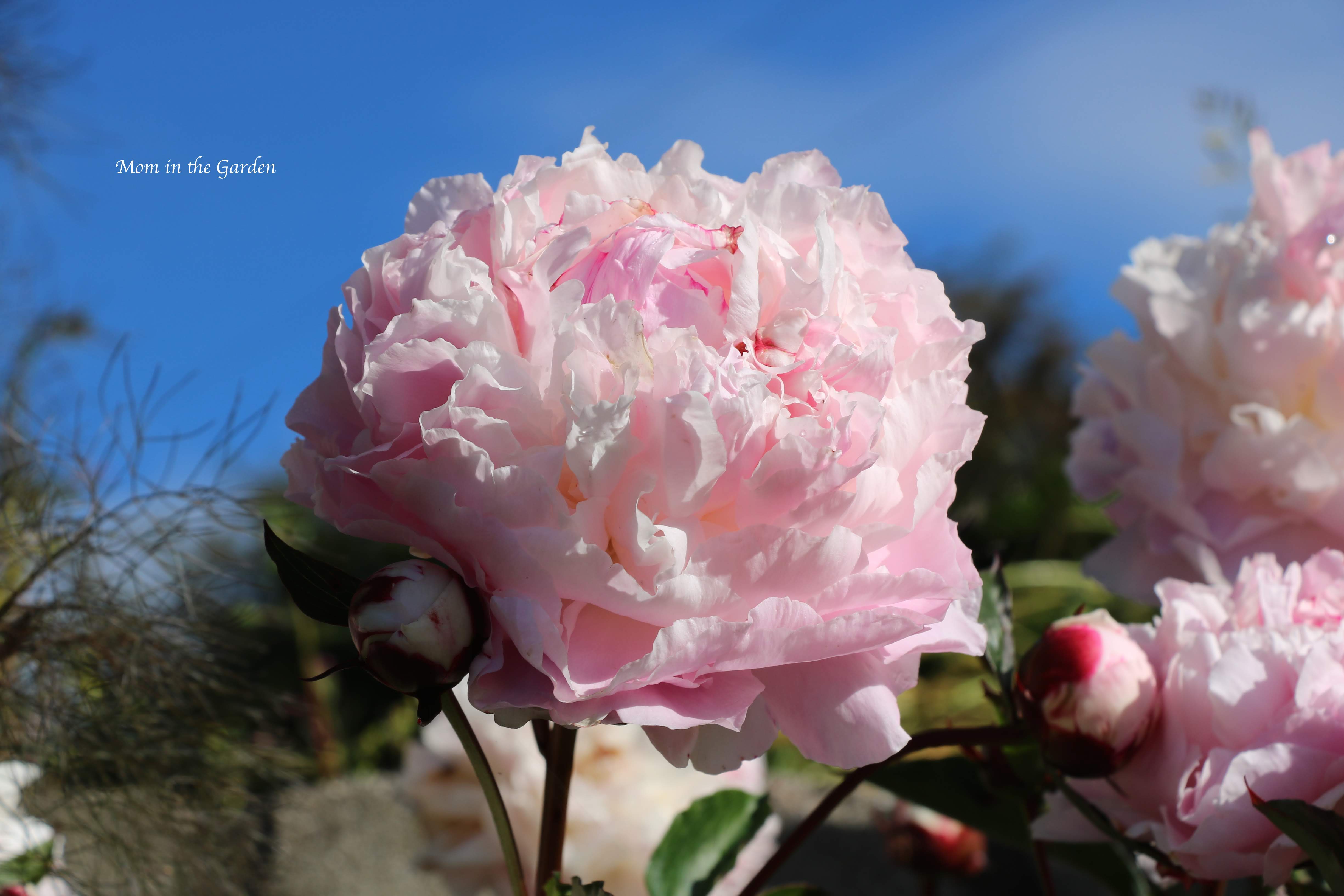 Pink white peony blue sky Published June 22, 2019 at 4898 × 3265 in Peonies in the Garden including an Itoh Hybrid Peony ‘Hillary’