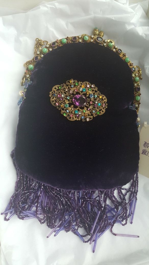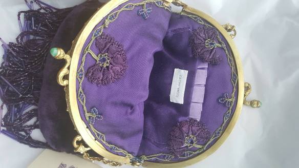 I am usually a frugal gal. Well, I will admit that being frugal most of the time allows me to splash out when the occasion arrises. I have no problem splashing out on certain things. It all just depends on the situation. Last year, I came across this vintage purse and it stopped me in my tracks. I thought, “this is beautiful!”. As my older daughter’s favorite color is purple, I thought it would be something nice for her to have for really special occasions (her Debs this year, maybe? or a wedding?…). This would be one of those cases where I thought “it is worth it”! So under the Christmas tree it went.
