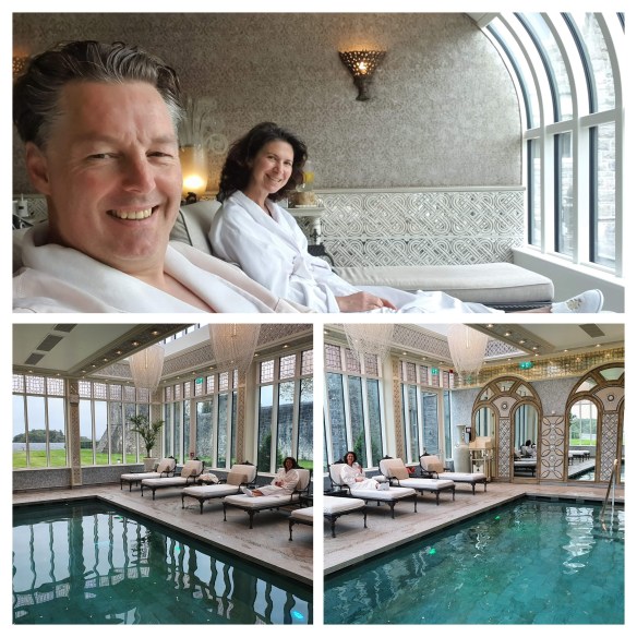 What else did I love? I loved the grandeur of the castle. Every room felt special, and yet inviting. The staff played their part in making us feel welcome and at home, too. We decided to have a look around the area, too, and left the grounds to go hiking. It wasn’t too far from the castle: ‘Sean Bóthar’ (the old road) between Clonbur and Corr na Móna, Co. Galway. It was lovely to get out and stretch our legs. And what better way to follow up a hike than with a spa treatment back at the castle! Due to Covid-19 restrictions, my husband and I were the only ones allowed to use the recovery room and the pool after our spa treatments, which was quite peaceful. The atmosphere was so relaxing. It was simply perfect to just enjoy being present in the moment. I also found the decorative wall at the pool to have stunning ceramic work. 🙂