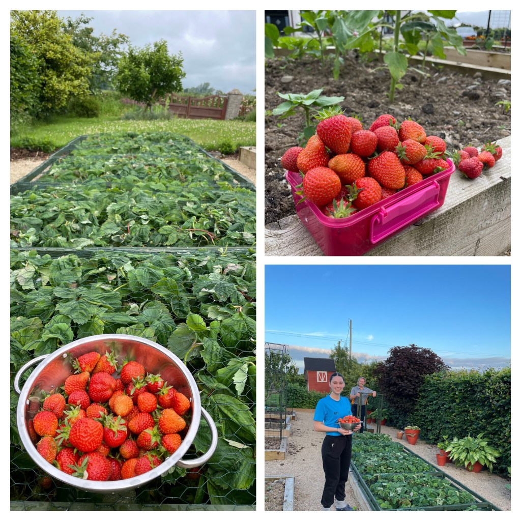 1 – Fruit from the garden. Last year we finally caged up our blueberries. What a harvest we had! Up until then, the birds were the beneficiaries of the delicious blueberries. We had a decent harvest of strawberries, too. The strawberry ice cream we made was quite a treat! It was the best harvest yet for our pears. My husband made a pear and almond torte (twice!) that was absolutely delicious – and well worth the work that went into making it. Finally, our apples: red eating and yellow/green cooking. There is something quite satisfying about eating an apple from your own tree! π