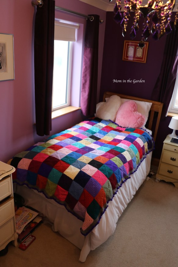 I used gray as the first border color to connect it to our elephant story. Although Elmer would have been patchwork, I crocheted two gray elephants for two corners, again to connect it to our story. The elephant pattern was fantastically easy, as written by Repeat Crafter Me. The purple border is because my daughter’s favorite color is purple.