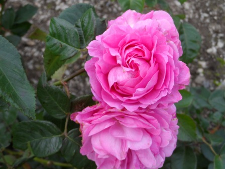 Zephirine Drouhin (1868). In this picture you can see the black spots on some of the leaves. (I must get out there and cut those off!) These roses are at my front gate.