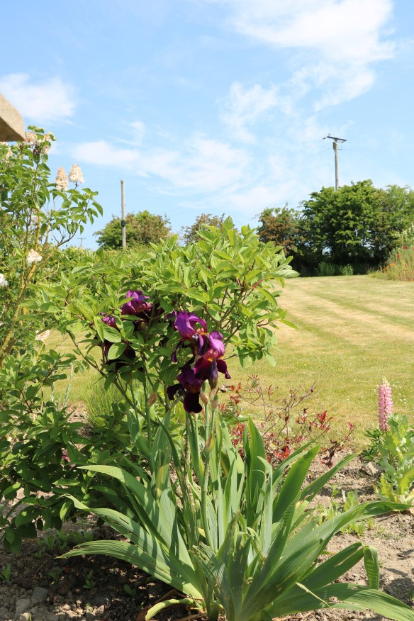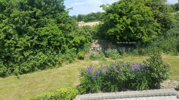 There was one more plant which we divided, another Iris actually, although this time not a bearded variety (so no rhizomes to keep at the surface!). I don’t have any pictures of what the area looks like now. But, here is a picture from before we moved any, when they were in bloom. The perspective is “higher” as I was actually leaning out of my bedroom window (being very careful though!). 🙂