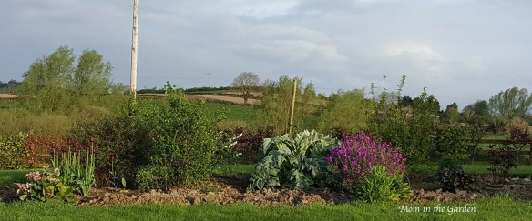 We have enjoyed flowers blooming in this bed all year, starting with our ‘winter sunshine’ Hellebore in January/February. The mild weather here in Ireland has the benefit of early blooming spring flowers, too. Now the bed is almost in full bloom with lots of color! I’m still waiting on the globe artichokes to bloom.