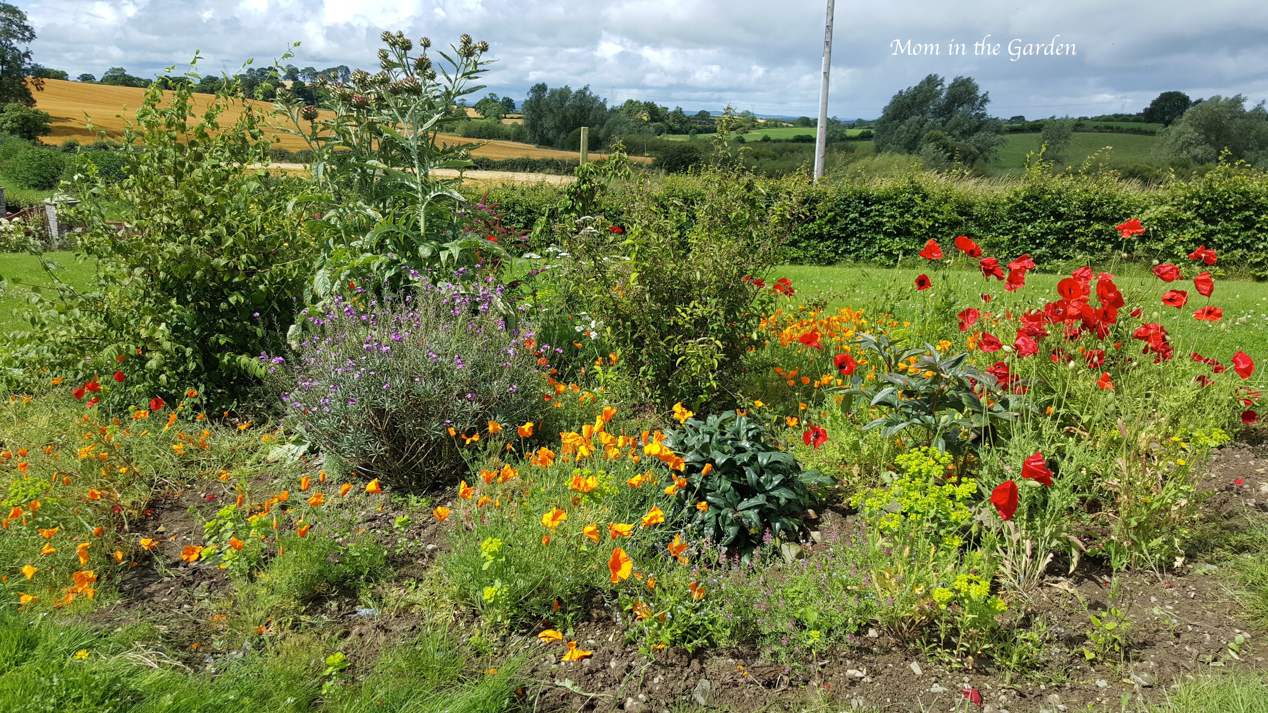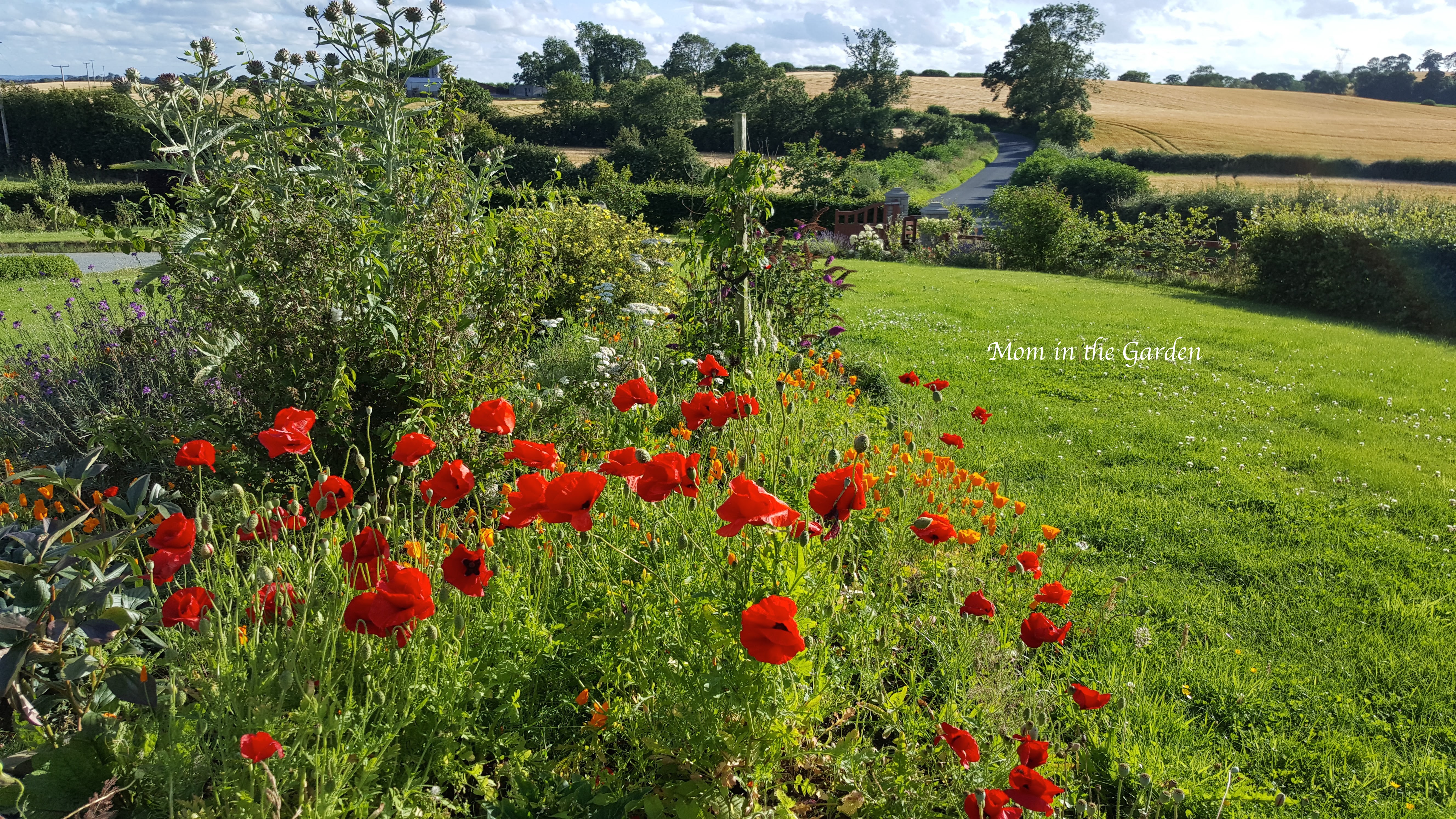 3, 4 & 5 – From top right: Pink Olivia Rose Austin roses, Red Admiral butterfly on Buddleia Buzz ‘Dark Pink’ Butterfly Bush, California poppy (orange) with yellow Potentilla shrub, Peacock butterfly on Buddleia Buzz butterfly bush.