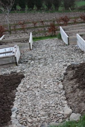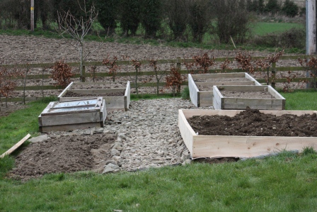 Our vegetable beds are filling in! We have newly planted main crop potatoes on the right. On the left we have fencing for our pea plants. In between the pea plants, some potatoes have decided to grow from last year’s crop. I’m really not sure what to do with them! I’ll probably earth them up when we do the main crop of potatoes, and see how they turn out.