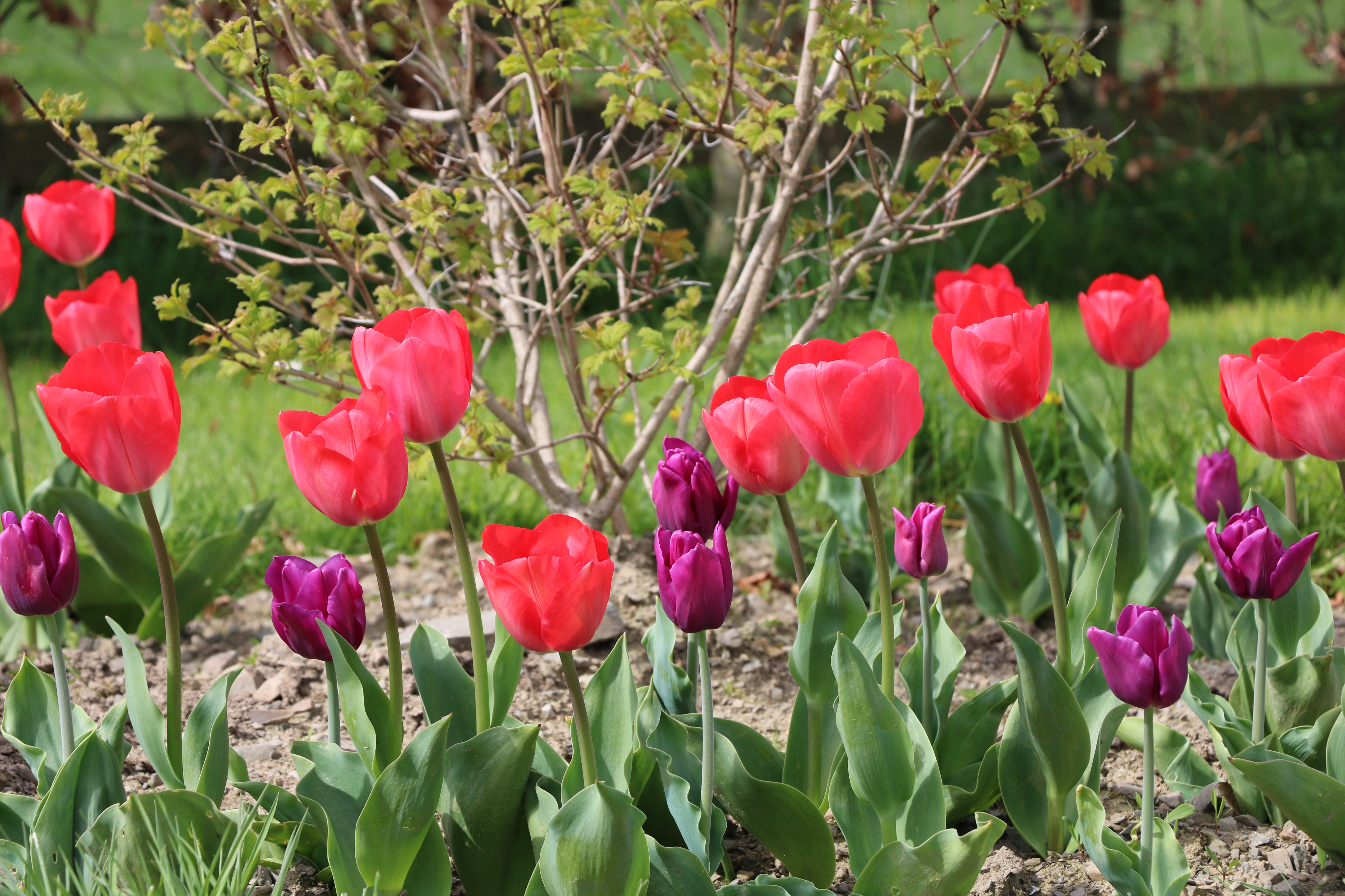 I think the ‘Rose bed’ looks so pretty at the moment, with the aubrietia (in front), purple anemone, pink and deep purple tulips and the rose bushes starting to fill out with leaves. Oh, and that blue sky sure helps!